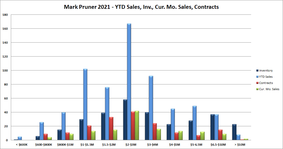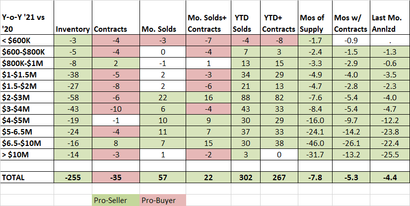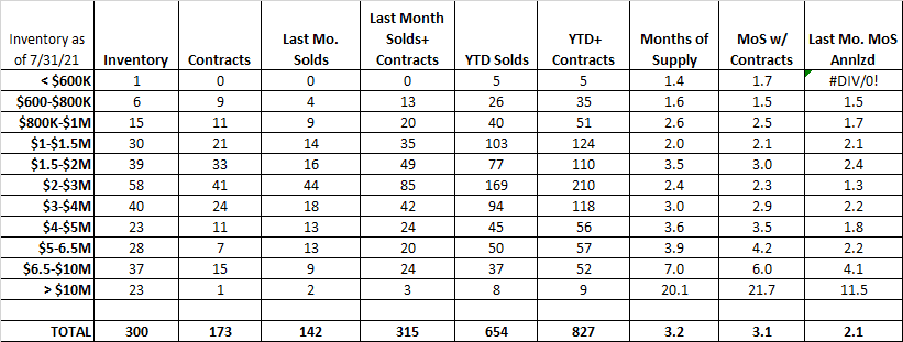 When you look at where the changes are year over year, the drop in inventory is a very consistent story. We have lower inventory at every price range from under $600K to over $10 million. Our inventory number are not just down by a little the smallest drop is 30% from $6.5 – 10 million from 53 listings in 2020 to only 37 listings as of the end of July this year. Under $600K we are down 75% from 4 listings to 1 listing and most of the year we have had nothing to sell under $600K.