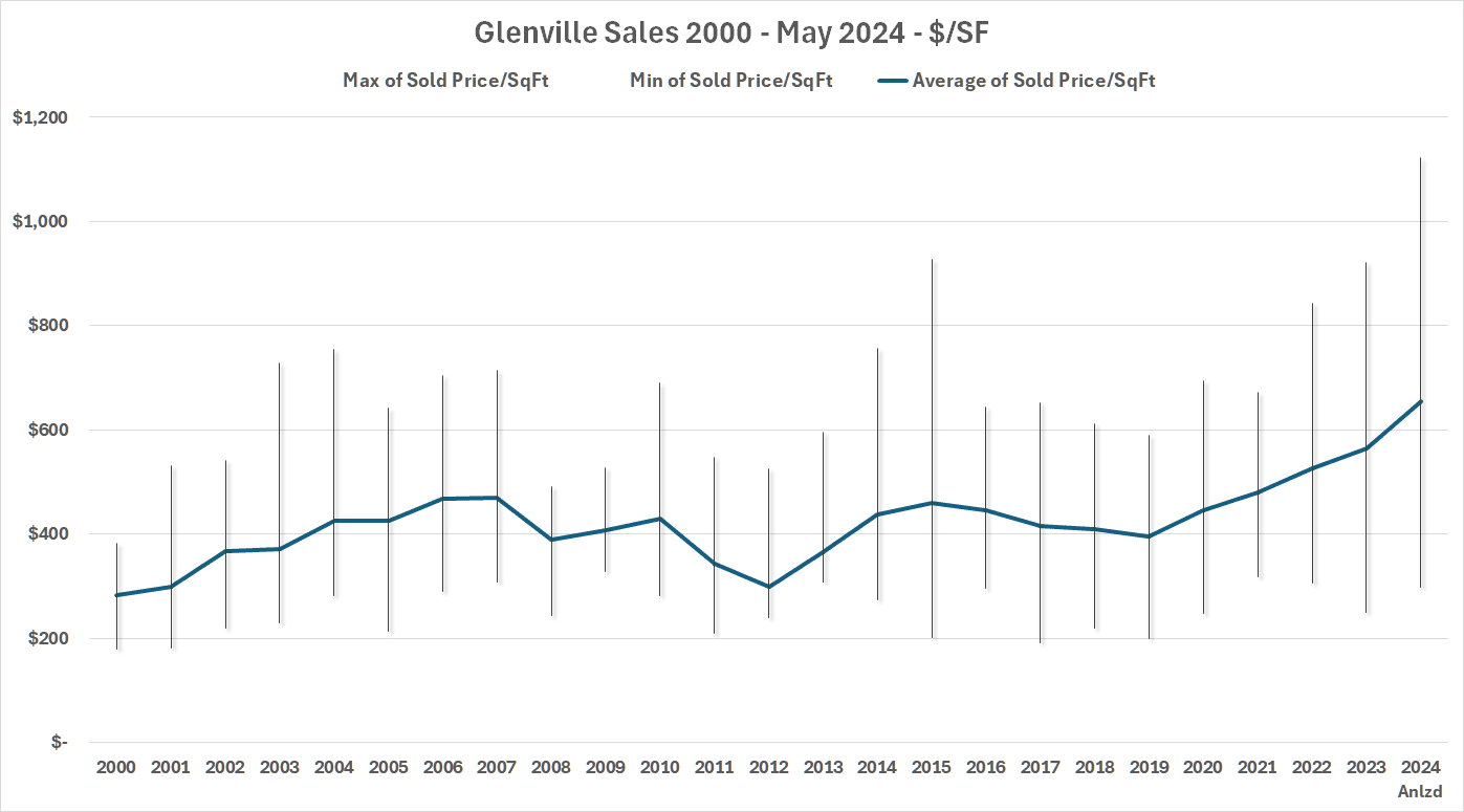 This diversity means that the price ranges in Glenville are some of the broadest in town. In 2023, we had 40 single-family sales in Glenville. The sales prices varied from a low of $650,000 to a high of $7,000,000. Now, the $7,000,000 was out in that eastern penumbra of the Glenville influence. Take out that sale, and the next sale highest was for $5,260,000 in Riversville. That one out-of-area sales skewed the average sales price in Glenville by $44,000. Bottomline, the broad price range, particularly, the highest-end sales makes the average annual sales prices bounce around in a manner that may not be reflective of where the market was going that year.