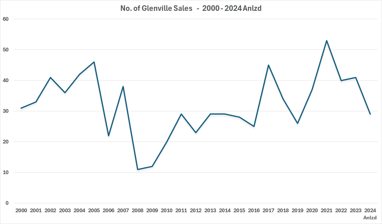 COVID caused a sudden upturn in Glenville, and townwide sales, in 2020 and 2021. We did see a drop in Glenville sales in 2022 and 2023, but sales in those years were still above our 21st Century average. So far this year we have had 10 sales, which when annualized comes out to 29 sales.