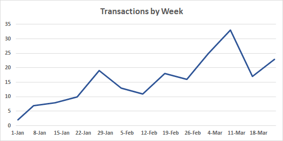 Our sales were up 36.5% in the 1st quarter from 74 sales last year to 101 sales this year. The coronavirus caused a slight dip in transaction in the third week of March, but transactions came back last week. For the month, we had 33 sales up from 27 sales in March 2019. This an increase of 22.2% despite the coronavirus and contracts are also up. We ended the quarter with 94 contracts waiting to close compared to 67 contracts at the end the first quarter in 2019 for a Y-o-Y increase of 40.3%.