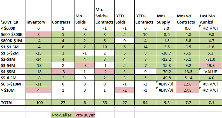 Bottomline, the coronavirus effect has essentially balanced out sales to a normal year. Fewer people are looking, but a larger percentage are buying. With inventory down and sales up our months of supply is also down from $600,000 to $6.5 million and the same when you add in contracts. While not a tight market it is a competitive market.