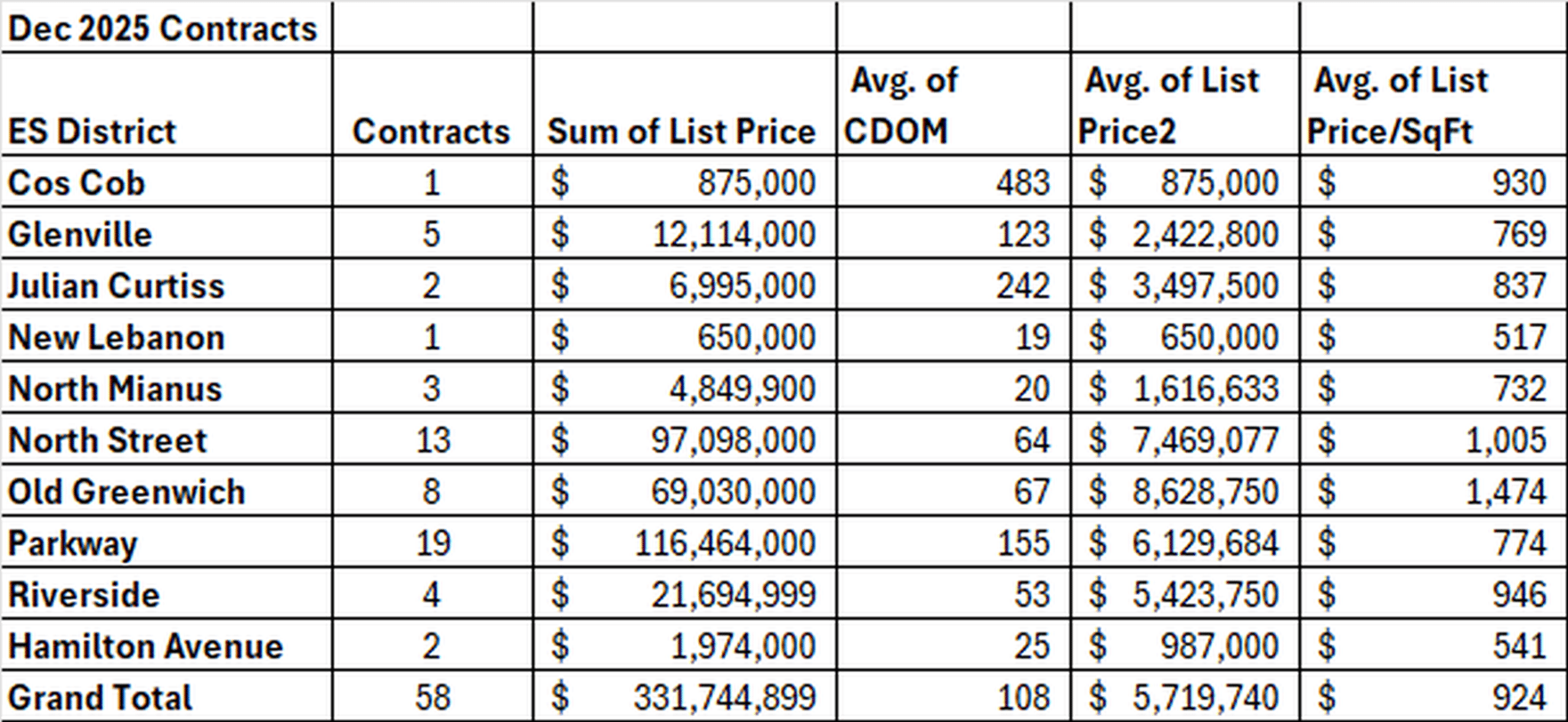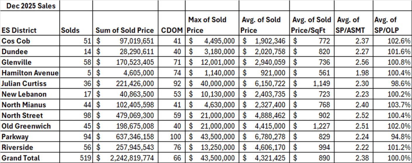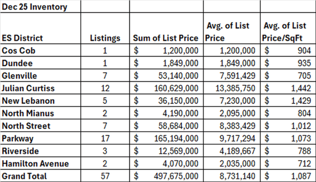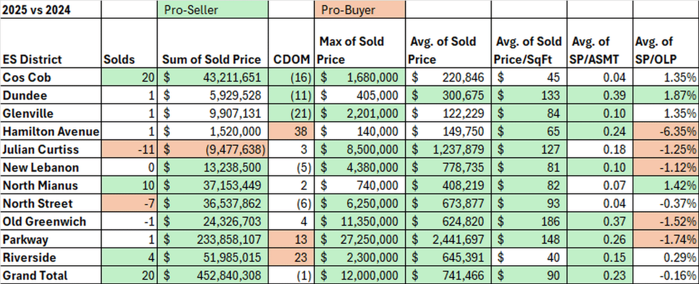 The district with the biggest increase in sales was the Cos Cob district. In 2024, Cos Cob had 31 sales. In 2025, Cos Cob saw an increase of 20 sales to 51 sales. We had more inventory come on this year in Cos Cob and more inventory means more sales in this hot market. The reverse is also true. In the North Street district lower inventory led to lower sales. It’s actually remarkable that it did as well as it did given the drop in inventory.
