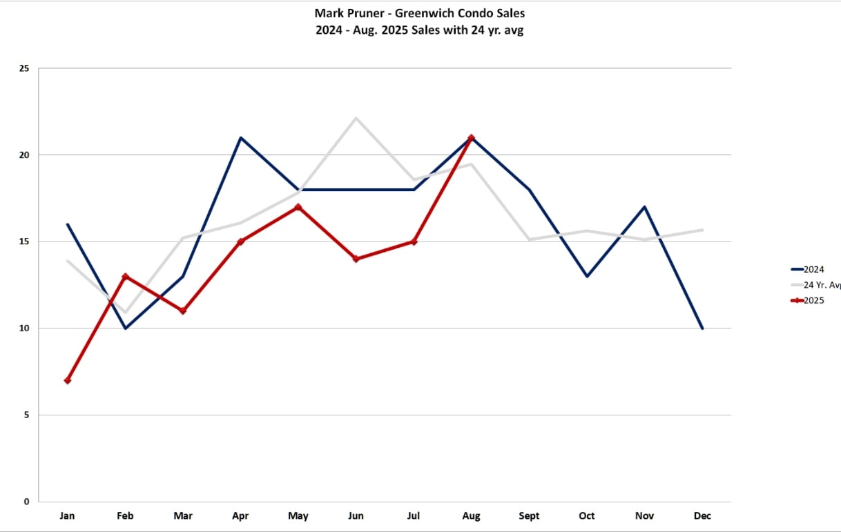 August finally looks like a good month for condo sales after they had been below our average monthly sales compared to our 25-year average. We’ll end the month with 21 condo sales, the same as last year. Overall, the poor sales in the earlier months this year, except for our shortest month, February, means that through August we have sold 110 condos and co-ops (all references to condos include co-ops) in Greenwich. This compares to 135 condo sales last year and our 25-year average of 134 condos.