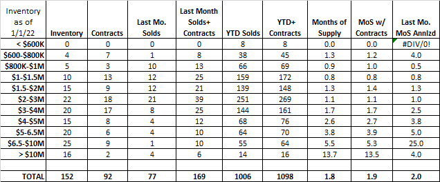 All this is happening while our inventory, which was never close to normal levels this year, dropped precipitously in the last part of the year. We started this year at 152 listings, when we should have around 400 listings. Pre-Covid you have to go back 21 years to Dec. 2000 for the prior record low number listings and that prior low was almost double what we have now. In 2000 we hit a low of 291 listings and this week we have 152 listings.