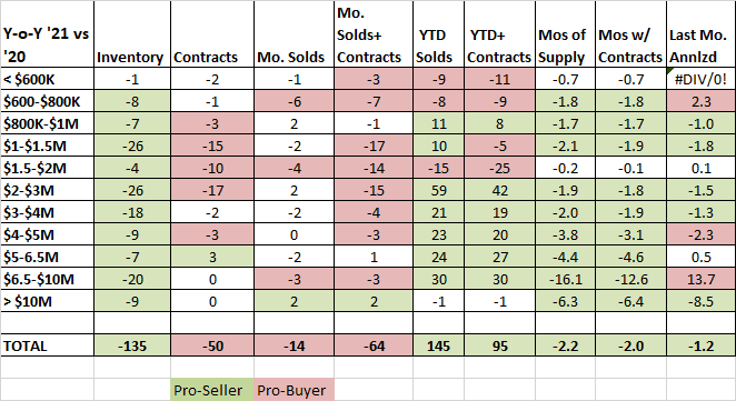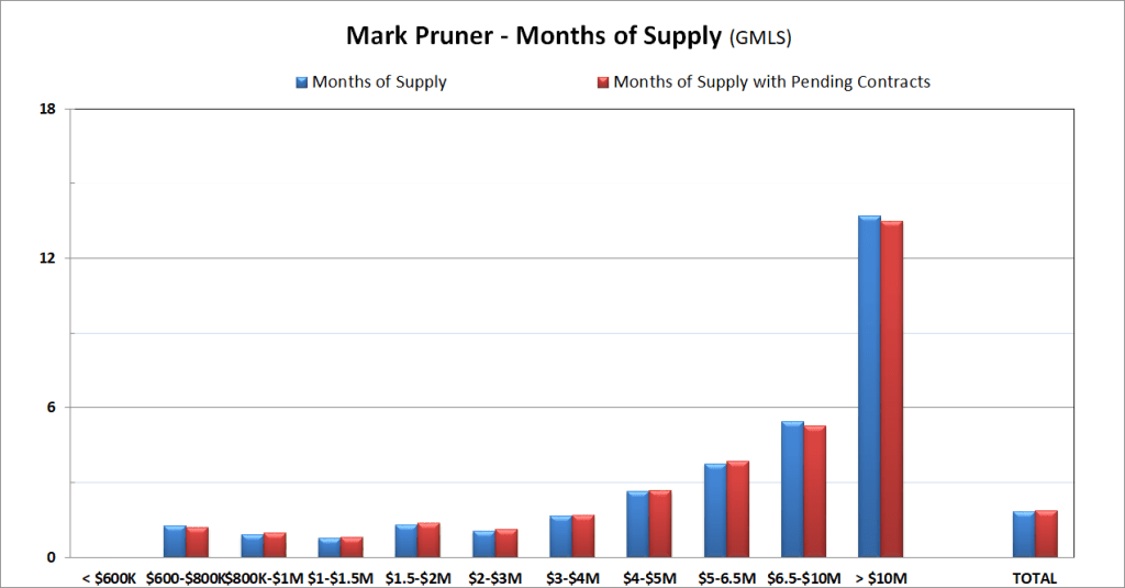 To see just how tight the market is check out our months of supply. The traditional dividing line between a buyer’s and a seller’s market is 6 months of supply, i.e., all listings would sell out in 6 months at the present rate of sales, if no more inventory came on the market. We have less than 6 months of supply all the way up to $10M and less than 3 months of supply under $5M.