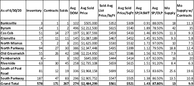 Byram, Pemberwick and North Mianus have seen the greatest appreciation since the Tax Assessor last did a revaluation in 2015. Byram is actually up 33% from 2015 when you compare the sales price to the assessment ratio. Pemberwick is up 18% from 2015 when you look at the same assessment ratio. Lots of folks want to live in Greenwich and those are our most affordable areas. This year a combination of all this prior appreciation and a desire for more social distancing have made these three neighborhoods slower this year than last year.