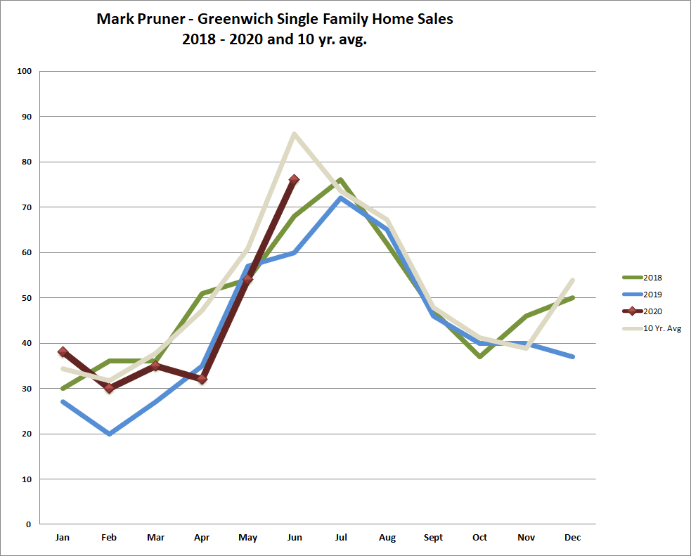 If you could take one day of the year and clone it for the rest of the year, that date would be June 30, 2020. On that date we sold 12 houses out of 76 sales for the whole month of June. Of those 12 sales, the average price was $5.93 million. A house at 49 Midwood Road sold for $10,750,000 after 435 days on the market and a house at 45 Field Point Circle sold for $12,800,000 after 220 days on the market. In addition, we had sales of $7,500,000, $4,995,000 and $4,200,000 all on June 30th. As I wrote last week, the July 1st increase of 1% in the state conveyance tax for sales over $2.5 million was the motivated factor to get all these high-end deals done before the new tax kicked in.
