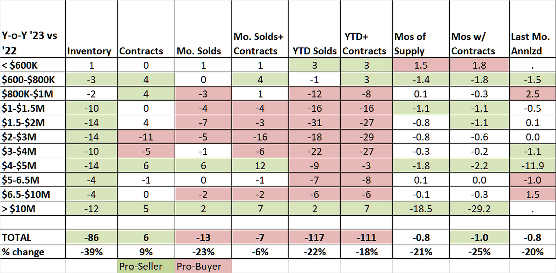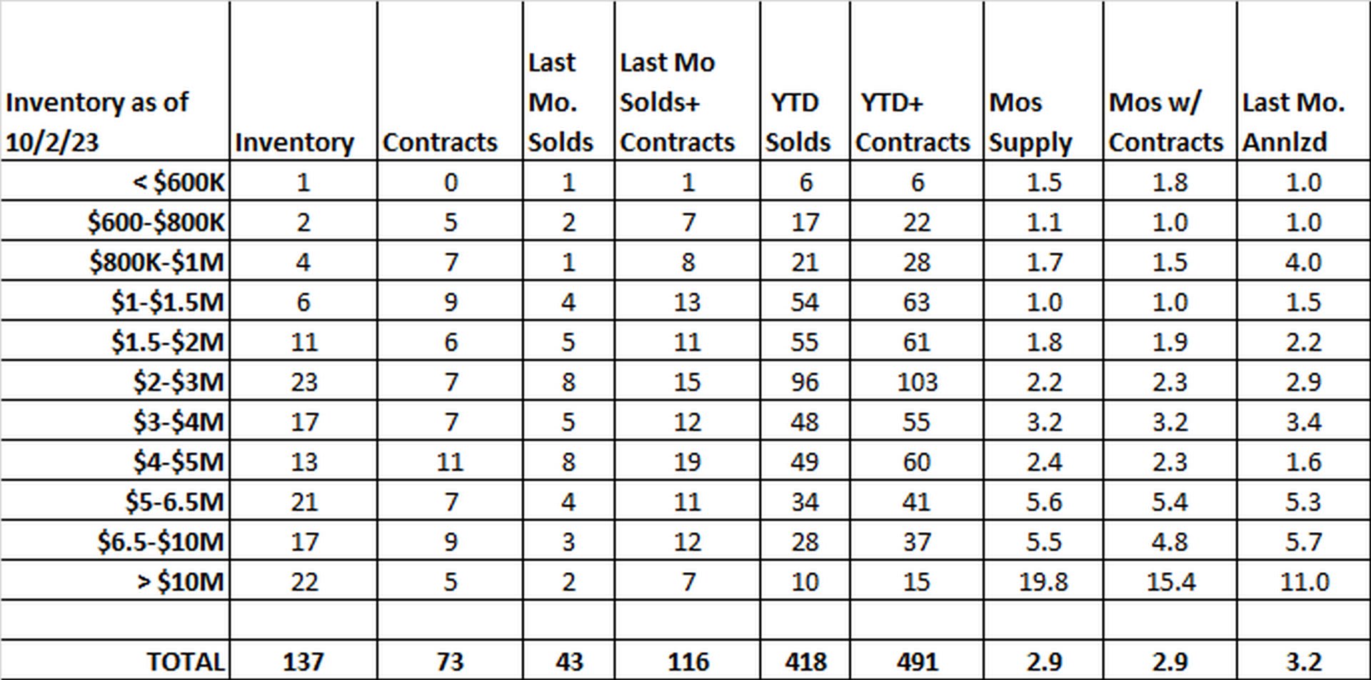 Overall, we are down 86 listings from September 2022, or a drop of 39%, which is remarkable when most people thought we'd never go lower than what we saw last year. What's really surprising is that in most price ranges, our contracts are up compared to last year, even with lower inventory. Also, our 73 contracts are actually six more than we had at the end of September 2022. Bottom line, more contracts with less inventory in the month of September.