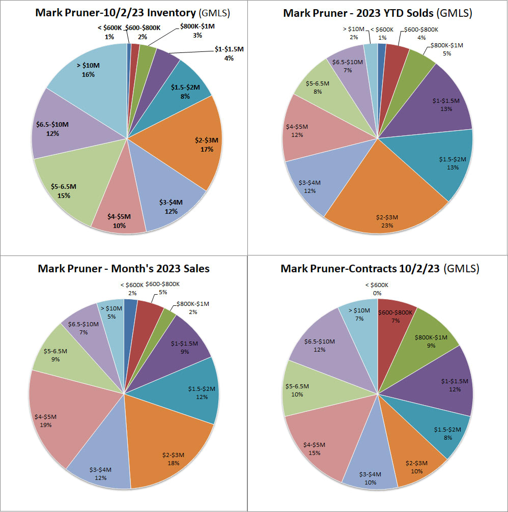 In no price category do we have more than 25 listings, and under $800,000, we only have 3 listings. On the sales side, 227 out of our 418 sales so far this year are between $1,000,000 and $3,000,000. Over $5 million, we have 72 sales YTD and only 60 listings for sale. It’s not until you get over $10 million that we have more inventory than we have sales.