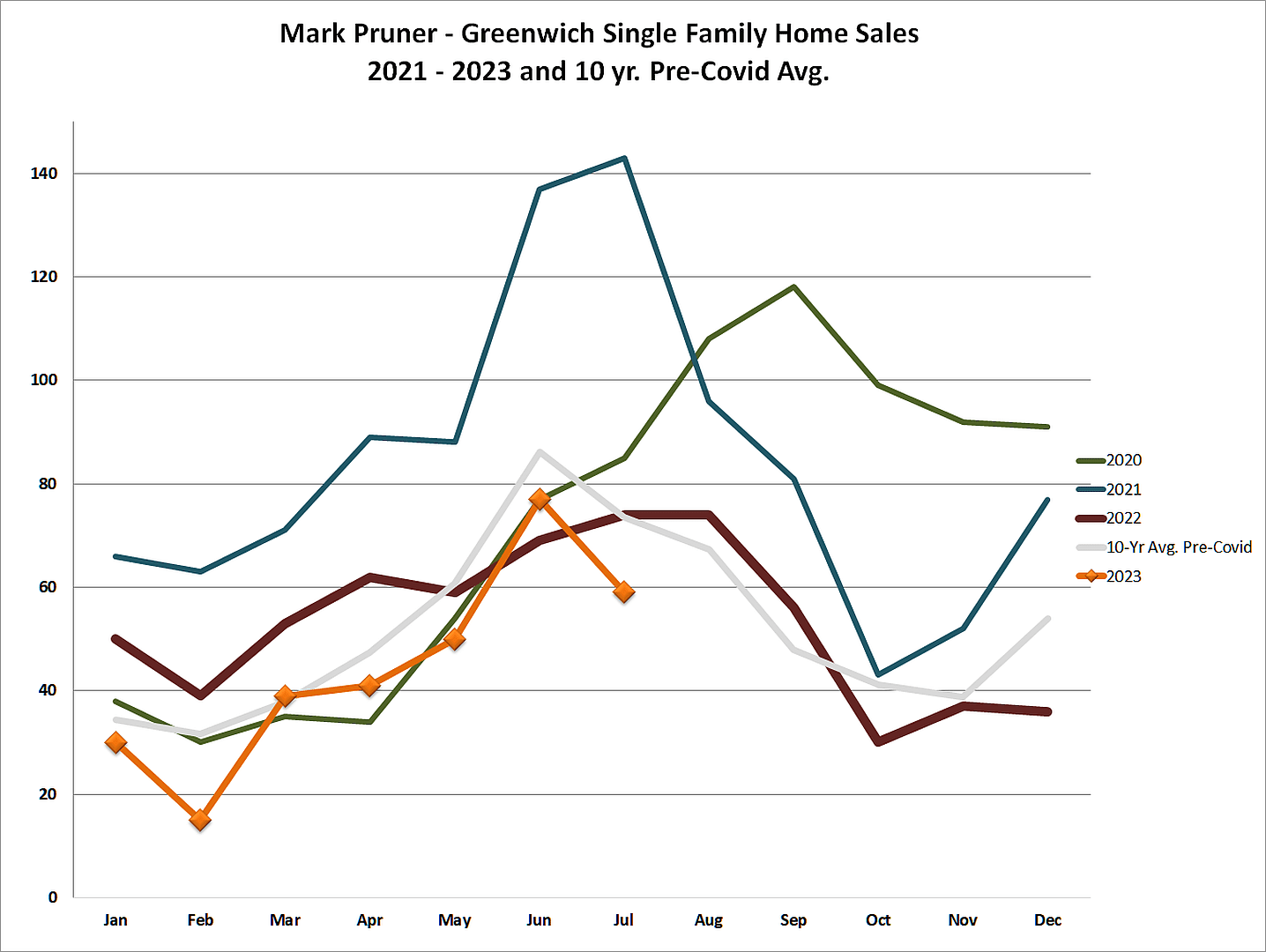 As prices kept going up in Old Greenwich and Riverside, I’ve been showing my value buyers more houses in Cos Cob and Glenville. In 2023, these two neighborhoods have been a tale of two cities. In Cos Cob, we have only had 13 sales so far this year, while in Glenville we have had 41 sales with 23 of those sales in the second quarter.
