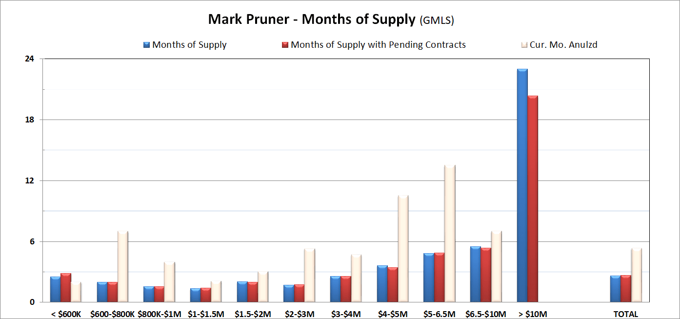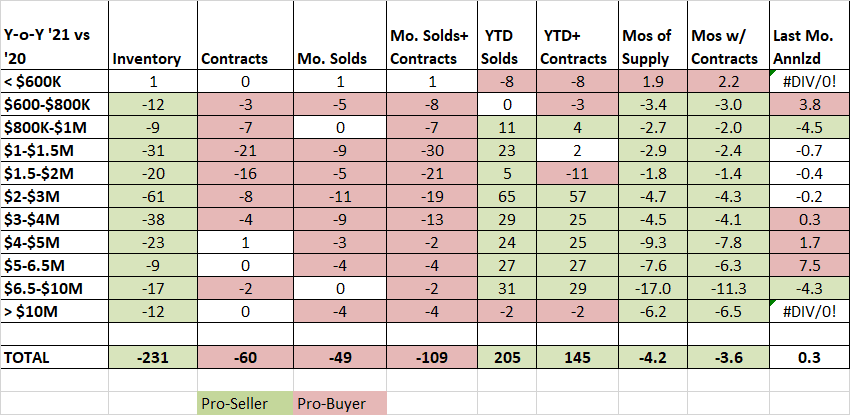 When you look at a table of inventory, you’ll see that none of our price ranges have over 40 listings. Two years ago, every price range from $1 million to $10 million had 40 or more listings. (OK, from $5 – 6.5 million we had 38 listings, but absolute statements always look more dramatic and 38 is very close to 40.)