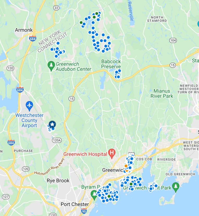 Greenwich is lucky in that we have a variety of communities. We have duplexes in the R-6 zone in Pemberwick. We have mid-rise apartments in downtown Greenwich and a variety of condos, but what usually gets the national press are some of our largest houses, selling for prices that can get into 8 figures. We have two areas that get particular attention along these lines, Belle Haven on Long Island Sound in the south and Conyers Farm in the north that overlaps the New York border.