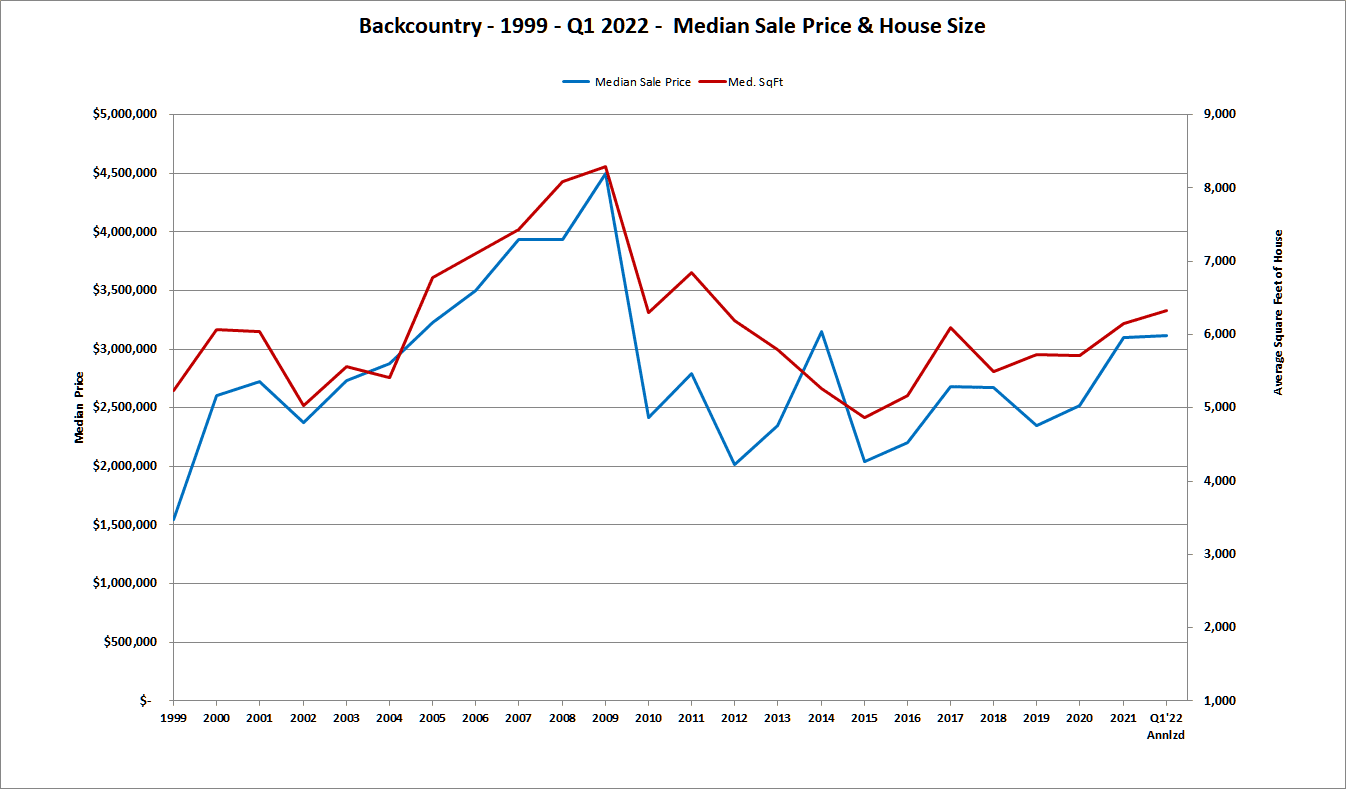 Backcountry has always been synonymous with larger houses, and we are seeing an uptick in our median size house sold. Our median house size peaked in 2009 at 8,300 s.f. From 2018 to 2020, our median house size has averaged around 5,600 s.f. In 2021 our median house size went up to 6,144 s.f. or more than 500 s.f. larger. So far in 2022, our median size is up again to 6,327 s.f., while our median house size for the town over all is 4,150 s.f. or almost 2,000 s.f. smaller.