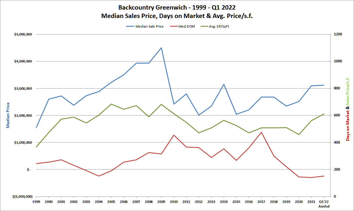 It’s easy to over analyze this market. There is a lot of Brownian motion in the numbers as the law of small numbers means that one sale like Tommy Hilfiger’s house selling for $45 million in 2021 throws off the averages. Take out that sale and the backcountry average sales price drops from $4.94 million to $3.03 million, which is still a pretty good average.