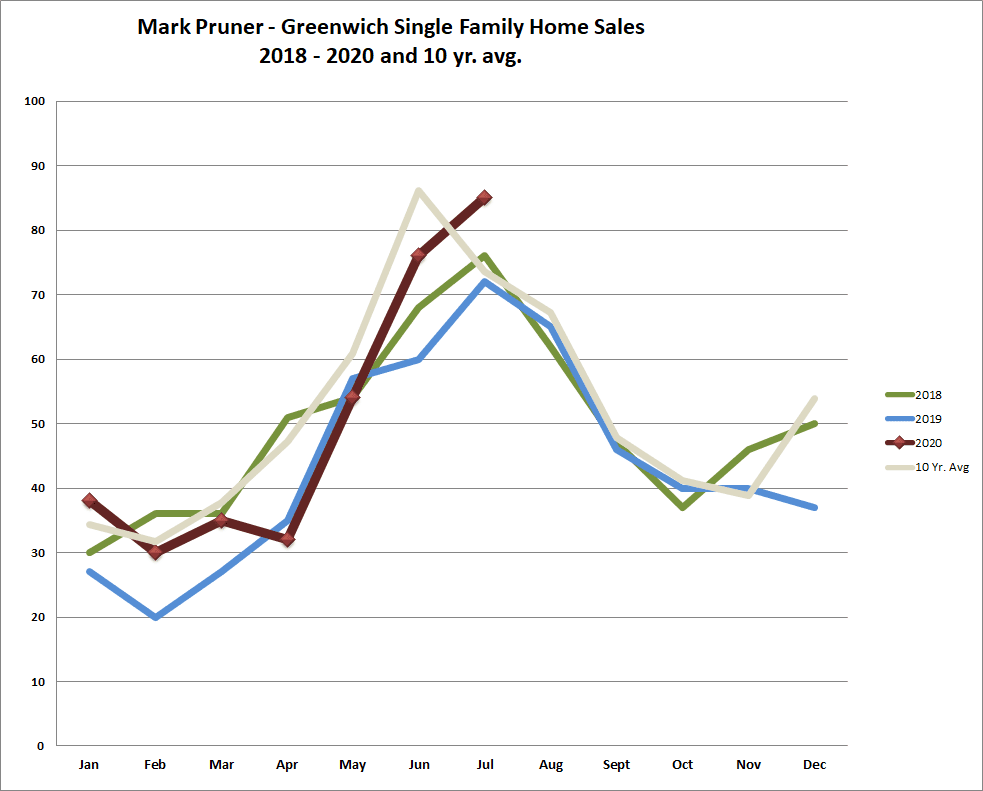 In July 2020, we had 85 sales of a single-family home in Greenwich. This blew away last year when we had 72 sales and is above our 10-year average of 74 sales. The sales are impressive, but what is really astounding is that we have 208 contracts waiting to close. This is up 119% from last year when we had a fairly normal 95 contracts at the end of July 2019. Contracts are up in every price range with a big jump in contracts between $1 and 4 million. Even our contracts over $4 million are up 21 contracts from last year going from 13 contracts to 34 contracts a jump of 161%.