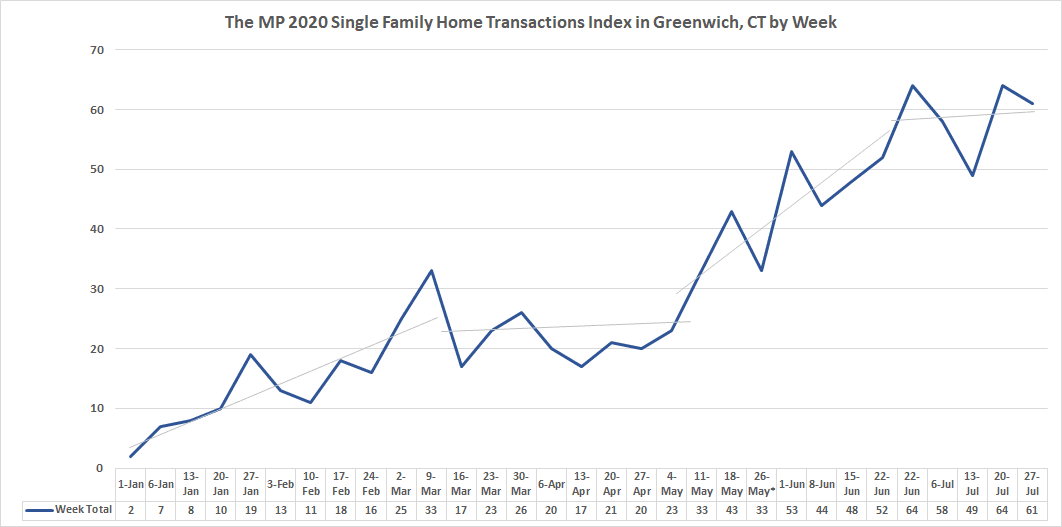 Our 10-year average for sales in August is 67 houses, so if a third of the houses under contract close in August we will still exceed our August average. The odds are that we are going to see a lot more than that. Of those 208 contracts, 148 are between $1 and $4 million, which means in Greenwich that most of those 148 families have school-age children who want to be in their house before the school year starts.
