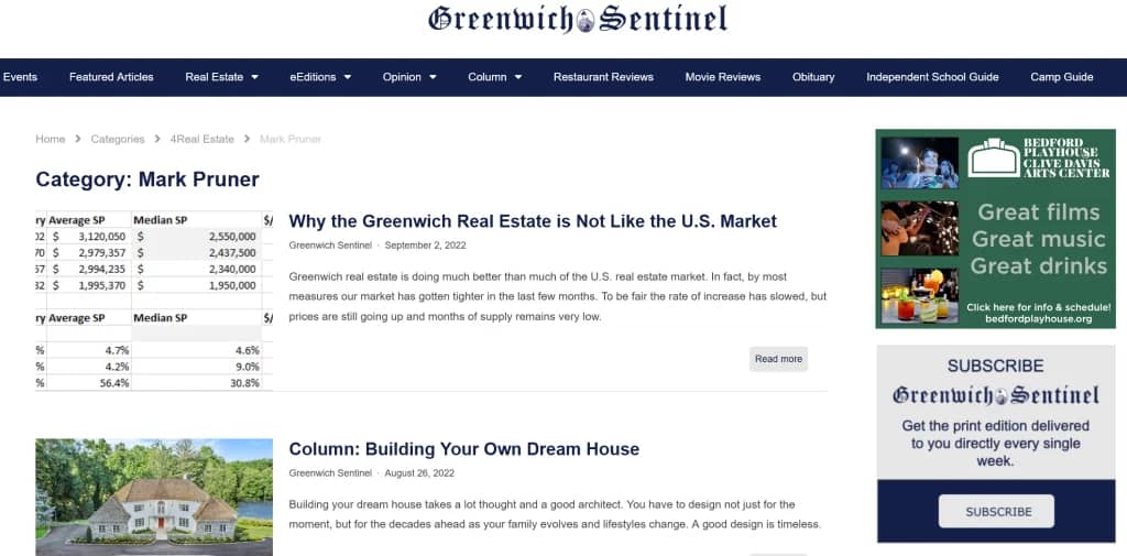 The Sentinel archives lots of my and other authors real estate articles with information on various town neighborhoods, market reports and market segments. Just go to greenwichsentinel.com and click on “Real Estate” in the top navigation. You can also find these at GreenwichStreets.com which will have a major redo next week with some cool videos and also with an archive of my articles back to 2018. (Back to be added 2013 to be added.) We also have podcasts of our Monday morning show on WGCH.
