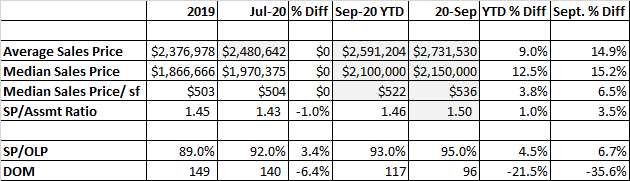 Our totals are all looking good with our average and median sales prices up 9.0% and 12.5% respectively compared to year-end 2019. When you look just at 116 September sales, our average and median prices are up even more as you would expect in an accelerating market.