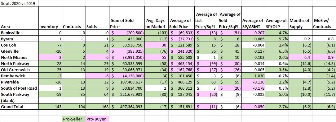 Looking at just these numbers you would think that everything, townwide is rosy. If, however, you look at the individual neighborhoods in Greenwich, you see more nuanced stories. Some neighborhoods are down in some categories and some neighborhoods are doing remarkably well compared to last year, but they still have a ways to go.