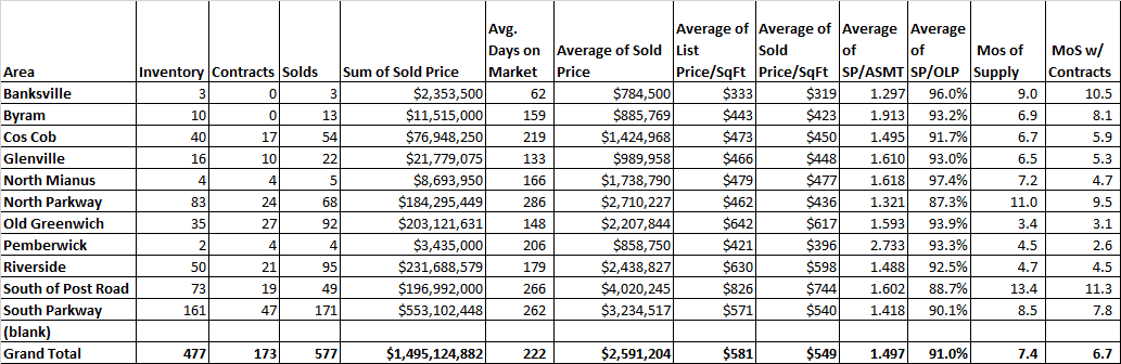 These three neighborhoods in the southeast part of town have traditionally been our family neighborhoods and as such, they have done very well this year. We have lots of families that have been cooped in small apartments in NYC with some very restless kids who are buying up houses left and right in these neighborhoods. Old Greenwich has 3.4 months of supply which is the very definition of combat buying. If you are a buyer, you need to be all cash or have a mortgage application that is underwritten and pre-approved, because you are not going to be the only people interested in the houses that are properly priced.
