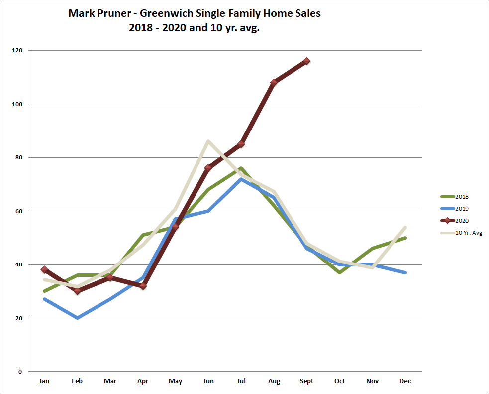 Once again sales of a single-family home in Greenwich set a record with 116 sales. This is up 150% from last year. We’ve never had a September with triple-digit sales. Post-recession, the highest number of sales reported on the Greenwich MLS was 63 sales in 2015. Given that we had 193 contracts at the end of August, I expected that we would have a very good September as these contracts closed, but I’m still surprised that sales set a new post-recession record for any month.