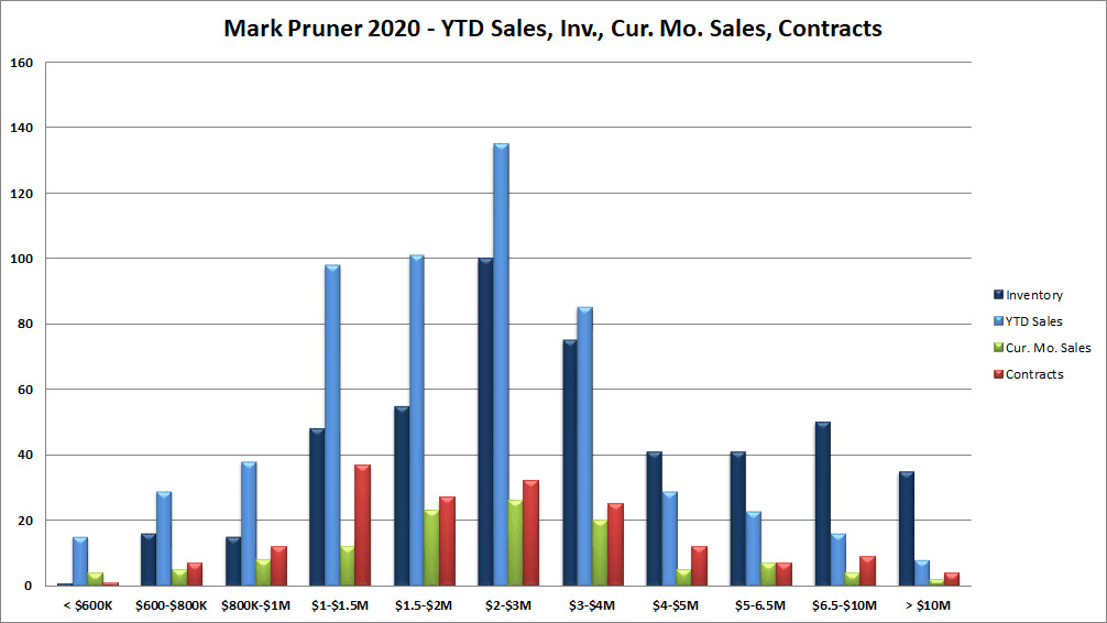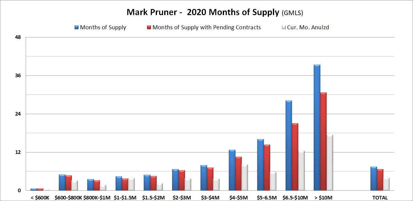 Over $10 million we are up 2 listings to 35 listings. As we are seeing an increase in high-end sales of over $5 million, we are seeing more people listing their houses. This increase in listings over $5 million has been mostly matched by sales. The result is big drops in months of supply starting at $3 million and going up. For example, when you take the 8 sales over $10 million and add in the 4 contracts, the months of supply have dropped from 4 years of supply to 2.5 years of supply.