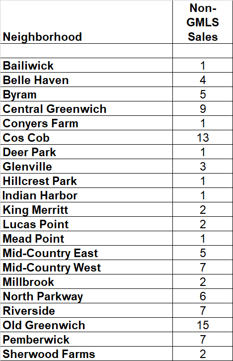 When you look at a specific neighborhood, like Old Greenwich, you can see how important knowing about the private sales. In OG 17% of the 86 sales in Old Greenwich were private. As with other neighborhoods, Old Greenwich off-market sales are skewed to the high-end. Eight of the 15 off-market sales were over our median price of $2.5 million.